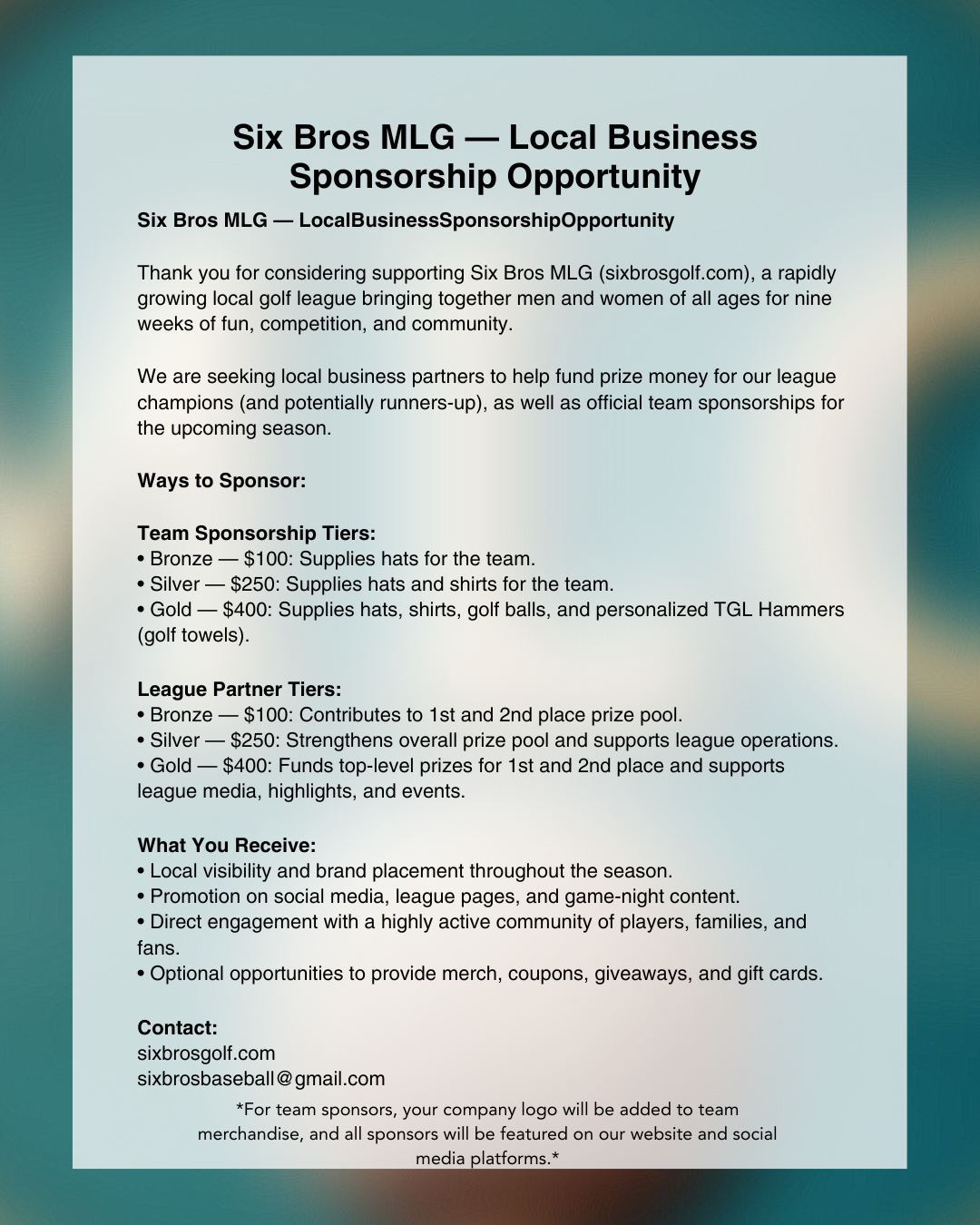 MLG - Presented by Six Bros. Baseball Academy